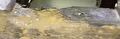 U kunt houtworm herkennen aan licht gekleurde poedervorming bij hout en de aanwezigheid van gaatjes. Een voorbeeld zie je hieronder: